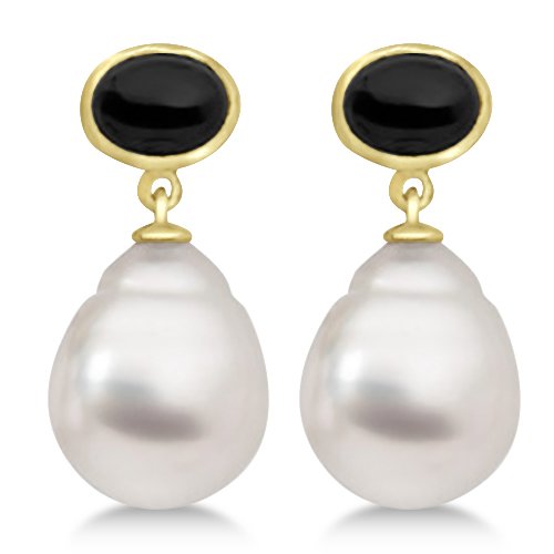 These 2ctw cabochon onyx and South Sea pearl 14K yellow gold earrings have a comfortable post and friction back for all day wear.